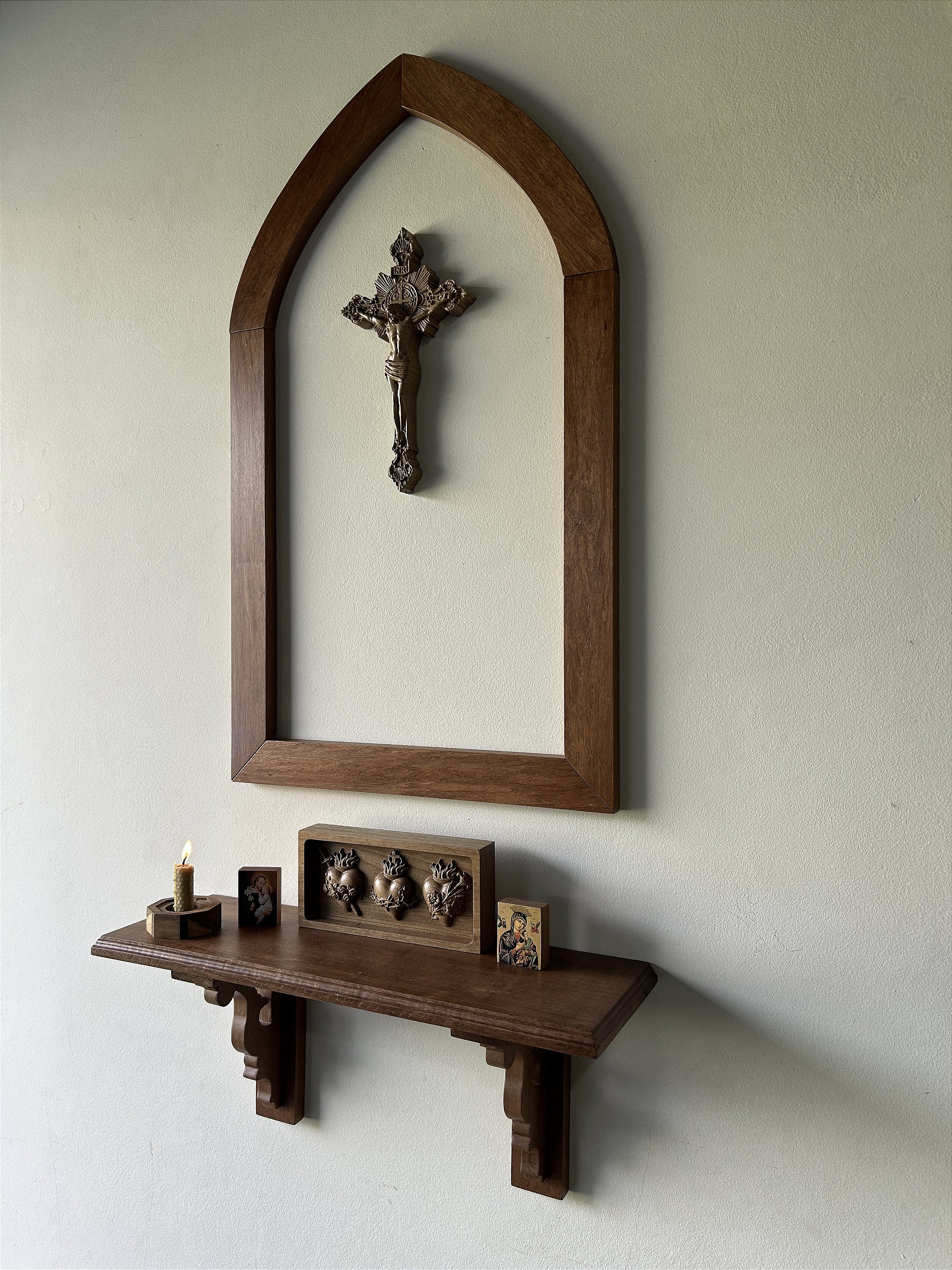 Seu design com moldura em arco ogival evoca a arquitetura das igrejas históricas, criando um espaço sagrado ideal para acolher imagens e promover momentos de oração e contemplação.