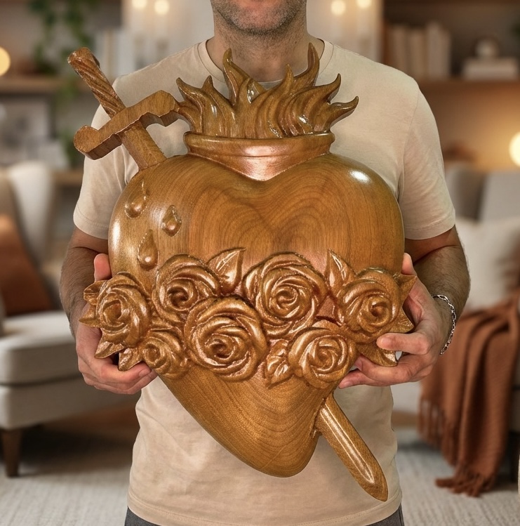 Entalhado em madeira maciça nobre. Acabamento Natural com cera de abelha.