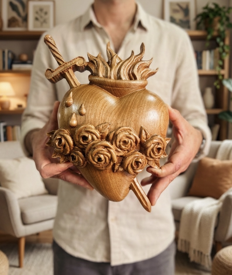 Entalhado em madeira maciça nobre. Acabamento Natural com cera de abelha.