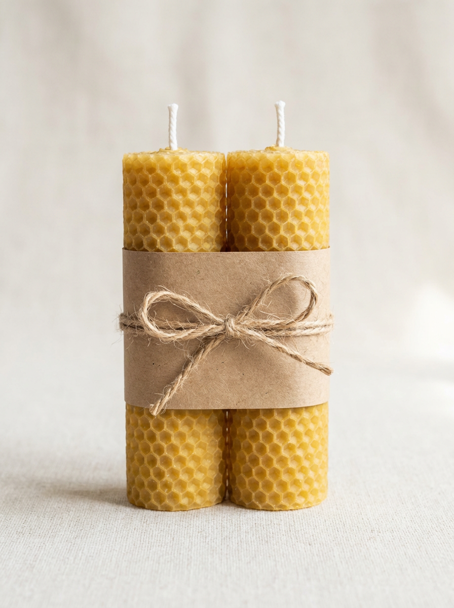 Nossas velas são produzidas com cera de abelha natural, um material nobre que carrega consigo pureza, tradição e um perfume suave, característico e acolhedor. Seu acabamento em textura de favo de mel revela um cuidado artesanal que transforma cada peça em um detalhe cheio de significado.